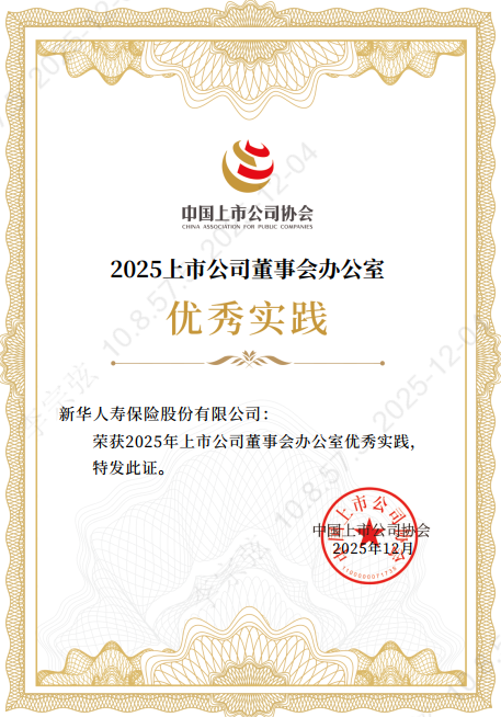 上市以來,新華保險持續優化公司治理、信息披露和投資者管理管理工作,堅持“專業、合規、服務”原則,不斷提升專業水準和工作質效。2025年,公司治理、信息披露和投資者關系管理工作更是聚焦公司戰略轉型和中心工作,在合規運作基礎上著力提升工作效能,傳遞公司價值和傳播公司品牌,助力公司高質量、高能級發展和投資價值的持續提升。2025年,公司治理持續完善,董事會運作進一步提質增效;信息披露工作連續第十年榮獲上交所信息披露工作最高評價A(優秀);投資者關系進一步深化,公司價值贏得廣泛認同。