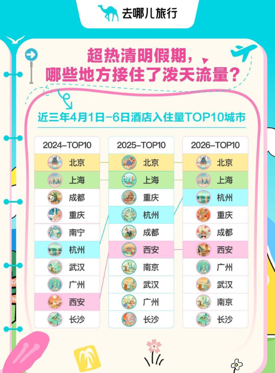 \r\n\u003c/a> -->\r\n","topAd":"\u003cdiv style=\"display:none\">\r\n\u003ca href=\"http://www.yumqqxq.cn/c/8if5o85BMMc\" target=\"_blank\" rel=\"noopener noreferrer\">\r\n\t\u003cimg src=\"http://x0.ifengimg.com/ucms/2025_16/EC4188F2C122C80153370CD0C9D6719401C58B33_size141_w1000_h90.jpg\" alt=\"文物三候 | 谷雨至,百谷潤;谷雨至,萬物生\"/>\r\n\u003c/a>\u003c/div>","floatAd":[],"newsList":[],"logoAd":[],"infoAd":[],"chipObj":{"asideAd5":"160455","contentBottomAd":"160449","asideAd4":"160454","picNews":"195259","asideAd3":"160453","searchPath":"200-203-","hardAd":"160450","recommend":"195258","video":"195129","asideAd2":"160452","asideAd1":"160451","topAd":"160447","floatAd":"160459","newsList":"195128","logoAd":"160448","infoAd":"195125"},"hostname":"www.yumqqxq.cn","docData":{"type":"article","noffhFlag":false,"fhhAccountDetail":{"cateid":"西安發布","type":"source","catename":"西安發布","description":"","cateSource":"","backgroud":"http://p1.ifengimg.com/ifengimcp/pic/20160919/d236177a15798b010c4c_size104_w720_h186.png","api":"http://api.iclient.ifeng.com/api_wemedia_list?type=source&keyword=%E8%A5%BF%E5%AE%89%E5%8F%91%E5%B8%83","originalName":"","redirectTab":"article","newsTime":"2026-04-08 08:02:37","authorUrl":""},"logo":{"logo":"http://x0.ifengimg.com/ucms/2020_35/047893747872F2451CE6A94069E0035D20860647_w322_h54.png","title":"陜西"},"domain":"www.yumqqxq.cn","base62Id":"8s8BSpuklAq","breadCrumbdata":[{"url":"/shanklist/200-/","title":"地方站"},{"url":"http://www.yumqqxq.cn/","title":"陜西"},{"url":"http://www.yumqqxq.cn/shanklist/200-203-216594-/","title":"資訊"}],"searchPath":"200-203-216594-,200-203-216594-216598-,200-203-216600-216601-","title":"西安清明假日旅游穩居全國第一梯隊","newsTime":"2026-04-08 08:02:37","wemediaEAccountId":"","source":"西安發布","sourceUrl":"","author":"","summary":"西安清明假日旅游穩居全國第一梯隊","imagesInContent":[{"size":370,"width":546,"url":"https://x0.ifengimg.com/ucms/2026_15/BEAB6ACC73A90E507BAA38F2D3C9B49979C1F008_size370_w546_h739.png","height":739},{"size":849,"width":800,"url":"https://x0.ifengimg.com/ucms/2026_15/8E0F65C75E666498DA6A5F5BFB340E8839A54C83_size849_w800_h1074.png","height":1074},{"size":772,"width":938,"url":"https://x0.ifengimg.com/ucms/2026_15/1F7BF020D40FFCF349284995DBFA722B7507F036_size772_w938_h528.png","height":528},{"size":89,"width":1080,"url":"https://x0.ifengimg.com/ucms/2026_15/C21780B206BEE796C4551F5D16AC550F9C958681_size89_w1080_h608.jpg","height":608},{"size":166,"width":1179,"url":"https://x0.ifengimg.com/ucms/2026_15/48E80291F511BB1BBC6FC2D5278438BA967FF84C_size166_w1179_h678.jpg","height":678}],"bdImg":"http://d.ifengimg.com/w121_h75_q90/x0.ifengimg.com/ucms/2026_15/BEAB6ACC73A90E507BAA38F2D3C9B49979C1F008_size370_w546_h739.png","pcUrl":"http://www.yumqqxq.cn/c/8s8BSpuklAq","url":"http://www.yumqqxq.cn/c/8s8BSpuklAq","commentUrl":"ucms_8s8BSpuklAq","skey":"eeff57","voteId":"ucms_8s8BSpuklAq","isOriginal":"0","contentData":{"contentList":[{"data":"\u003cp>原標題:西安清明假日旅游穩居全國第一梯隊\u003c/p>\u003cp>春和景明,萬物生輝。2026年清明假期恰逢多地中小學增設春假,“春假+清明”打造6天“不調休”春日黃金周,為全國文旅市場注入強勁動能。西安超前謀劃、精心部署,創新文旅產品供給,推出系列春日主題活動,推動文旅消費擴容提質,假日期間全市文旅市場供需兩旺、平穩有序,千年古都盡顯蓬勃生機與獨特魅力,旅游熱度持續穩居全國第一梯隊。\u003c/p>\u003cp>\u003cstrong>多項數據領跑\u003c/strong>\u003c/p>\u003cp>\u003cstrong>躋身全國熱門目的地前列\u003c/strong>\u003c/p>\u003cp>\u003cimg src=\"https://x0.ifengimg.com/ucms/2026_15/BEAB6ACC73A90E507BAA38F2D3C9B49979C1F008_size370_w546_h739.png\" />\u003c/p>\u003cp>多家主流旅游平臺數據印證西安假日旅游的超強吸引力。飛豬平臺數據顯示,西安成功躋身清明假期旅游預訂全國十大熱門城市,與上海、北京、廣州等城市并列,成為春日出游首選;去哪兒旅行數據表明,4月1日至6日,西安酒店預訂量位列全國前十,北京、廣州、西安等文化名城酒店入住量增長均超三成,“邊玩邊學”的研學旅游需求持續升溫。\u003c/p>\u003cp>\u003cimg src=\"https://x0.ifengimg.com/ucms/2026_15/8E0F65C75E666498DA6A5F5BFB340E8839A54C83_size849_w800_h1074.png\" />\u003c/p>\u003cp>同程旅行《2026春假及清明假期旅游總結報告》指出,西安位列國內熱門目的地城市榜單,假期度假訂單中親子人群占比達四成,同比增長近20個百分點,親子長線游訂單同比翻倍,同時躋身全國自駕游熱門目的地前十,租車出行需求旺盛。攜程數據顯示,西安OTA接待人次位列全國第9位,入境旅游市場強勁增長,高品質旅游產品、親子游與自然生態類景區備受游客青睞。\u003c/p>\u003cp>\u003cstrong>央媒聚焦點贊\u003c/strong>\u003c/p>\u003cp>\u003cstrong>全方位展現古都文旅魅力\u003c/strong>\u003c/p>\u003cp>西安亮眼的文旅表現,受到人民日報、央視新聞、光明日報、央廣網、新華網等中央主流媒體高度關注與全方位報道。\u003c/p>\u003cp>\u003cimg src=\"https://x0.ifengimg.com/ucms/2026_15/1F7BF020D40FFCF349284995DBFA722B7507F036_size772_w938_h528.png\" />\u003c/p>\u003cp>央視《朝聞天下》欄目聚焦西安航空出行熱度,報道西安咸陽國際機場4月4日預計運送旅客12萬人次,假期首日陜西重點景區游客接待量同比大幅增長,西安作為核心旅游城市貢獻突出;央視《家國清明》欄目以“詩意清明·陜西西安:詩韻越千年,興慶宮畔尋春光”為題,深度展現西安傳統文化與春日文旅融合的生動實踐;央廣網專題發布陜西及西安188項文旅活動內容,央視新聞持續跟蹤報道西安交通保暢與文旅市場運行動態,全面彰顯西安文旅的品牌影響