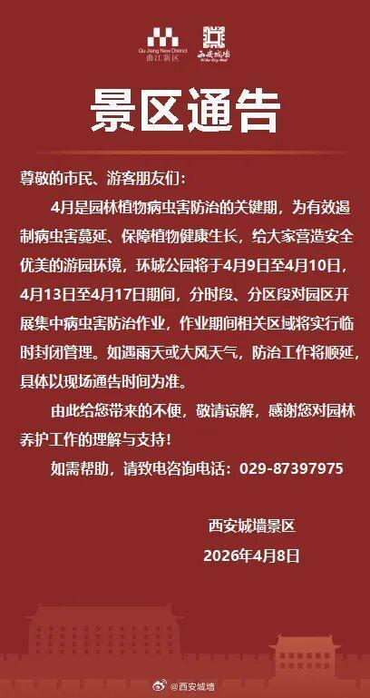 \r\n\u003c/a> -->\r\n","topAd":"\u003cdiv style=\"display:none\">\r\n\u003ca href=\"http://www.yumqqxq.cn/c/8if5o85BMMc\" target=\"_blank\" rel=\"noopener noreferrer\">\r\n\t\u003cimg src=\"http://x0.ifengimg.com/ucms/2025_16/EC4188F2C122C80153370CD0C9D6719401C58B33_size141_w1000_h90.jpg\" alt=\"文物三候 | 谷雨至,百谷潤;谷雨至,萬物生\"/>\r\n\u003c/a>\u003c/div>","floatAd":[],"newsList":[],"logoAd":[],"infoAd":[],"chipObj":{"asideAd5":"160455","contentBottomAd":"160449","asideAd4":"160454","picNews":"195259","asideAd3":"160453","searchPath":"200-203-","hardAd":"160450","recommend":"195258","video":"195129","asideAd2":"160452","asideAd1":"160451","topAd":"160447","floatAd":"160459","newsList":"195128","logoAd":"160448","infoAd":"195125"},"hostname":"www.yumqqxq.cn","docData":{"type":"article","noffhFlag":false,"fhhAccountDetail":{"cateid":"西安城墻景區","type":"source","catename":"西安城墻景區","description":"","cateSource":"","backgroud":"http://p1.ifengimg.com/ifengimcp/pic/20160919/d236177a15798b010c4c_size104_w720_h186.png","api":"http://api.iclient.ifeng.com/api_wemedia_list?type=source&keyword=%E8%A5%BF%E5%AE%89%E5%9F%8E%E5%A2%99%E6%99%AF%E5%8C%BA","originalName":"","redirectTab":"article","newsTime":"2026-04-09 08:26:52","authorUrl":""},"logo":{"logo":"http://x0.ifengimg.com/ucms/2020_35/047893747872F2451CE6A94069E0035D20860647_w322_h54.png","title":"陜西"},"domain":"www.yumqqxq.cn","base62Id":"8sA2vGSad95","breadCrumbdata":[{"url":"/shanklist/200-/","title":"地方站"},{"url":"http://www.yumqqxq.cn/","title":"陜西"},{"url":"http://www.yumqqxq.cn/shanklist/200-203-216594-/","title":"資訊"}],"searchPath":"200-203-216594-","title":"西安城墻景區發布通告","newsTime":"2026-04-09 08:26:52","wemediaEAccountId":"","source":"西安城墻景區","sourceUrl":"","author":"","summary":"西安城墻景區發布通告","imagesInContent":[{"size":54,"width":408,"url":"https://x0.ifengimg.com/ucms/2026_15/58C12CE61BCE1ED6740A73C9B36F6516AE95A3C2_size54_w408_h769.jpg","height":769}],"bdImg":"http://d.ifengimg.com/w121_h75_q90/x0.ifengimg.com/ucms/2026_15/58C12CE61BCE1ED6740A73C9B36F6516AE95A3C2_size54_w408_h769.jpg","pcUrl":"http://www.yumqqxq.cn/c/8sA2vGSad95","url":"http://www.yumqqxq.cn/c/8sA2vGSad95","commentUrl":"ucms_8sA2vGSad95","skey":"ce6e6c","voteId":"ucms_8sA2vGSad95","isOriginal":"0","contentData":{"contentList":[{"data":"\u003cp>原標題:西安城墻景區發布通告\u003c/p>\u003cp>4月8日\u003c/p>\u003cp>西安城墻景區發布通告\u003c/p>\u003cp>↓↓↓\u003c/p>\u003cp>\u003cimg src=\"https://x0.ifengimg.com/ucms/2026_15/58C12CE61BCE1ED6740A73C9B36F6516AE95A3C2_size54_w408_h769.jpg\" />\u003c/p>\u003cp>通告稱,4月是園林植物病蟲害防治的關鍵期,為有效遏制病蟲害蔓延、保障植物健康生長,給大家營造安全優美的游園環境,環城公園將于4月9日至4月10日,4月13日至4月17日期間,分時段、分區段對園區開展集中病蟲害防治作業,作業期間相關區域將實行臨時封閉管理。如遇雨天或大風天氣,防治工作將順延,具體以現場通告時間為準。\u003c/p>\u003cp>如需幫助,請致電咨詢電話:029-87397975\u003c/p>","type":"text"}],"currentPage":0,"pageSize":1},"editorName":"康雨馨","faceUrl":"","vestAccountDetail":{},"subscribe":{"cateid":"西安城墻景區","type":"source","catename":"西安城墻景區","description":"","cateSource":"","backgroud":"http://p1.ifengimg.com/ifengimcp/pic/20160919/d236177a15798b010c4c_size104_w720_h186.png","api":"http://api.iclient.ifeng.com/api_wemedia_list?type=source&keyword=%E8%A5%BF%E5%AE%89%E5%9F%8E%E5%A2%99%E6%99%AF%E5%8C%BA","originalName":"","redirectTab":"article","newsTime":"2026-04-09 08:26:52","authorUrl":""}},"keywords":"病蟲害,景區,西安城墻,通告","hasCopyRight":false,"sourceReason":"公開信息","isHubeiLocal":false,"interact":{"isCloseShare":false,"isCloseLike":false,"isOpenCandle":false,"isOpenpray":false},"__nd__":"ne883dbn.ifeng.com","__cd__":"c01049em.ifeng.com"};