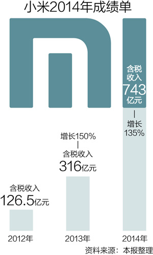 “站在風口”的小米公布了2014年的成績單:共銷售了6112萬部手機,增長227%;含稅收入743億元,增長135%。