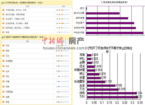 對于購買商住房的顧慮,“產權時間短”和“生活成本高”成為購房者普遍顧慮的因素。中新網房產頻道的調查結果顯示,分別有22.8%和26.1%的網友把票投給了這兩個選項。數字100市場研究公司的結果也顯示,分別有50.4%和43.6%選擇了這兩個答案。