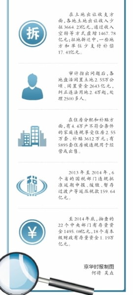 受國務院委托,審計署審計長劉家義昨天向十二屆全國人大常委會第十五次會議作了關于2014年度中央預算執行和其他財政收支的審計工作報告。報告首次披露了土地審計及財政存量資金審計情況。