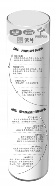 7月24日,蒙牛乳業、雅士利及達能簽訂了一份諒解備忘錄:達能有意向蒙牛旗下雅士利公司轉讓達能持有的全部多美滋中國的股權,與此同時,達能將使用轉讓多美滋中國股權所得收益,通過中糧乳業投資有限公司認購蒙牛乳業定向增發的股份。各方將就本次交易意向展開盡職調查并簽訂正式協議。