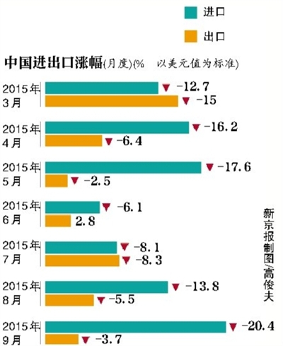新京報訊(記者 趙毅波)10月13日海關總署公布的9月貿易數據喜憂參半,令即將于下周公布的中國第三季度GDP增速數據蒙上陰影。出口增幅連續第三個月為負值;進口跌幅進一步擴大,連續第11個月出現負值,成為2008年金融危機以來持續時間最長的“連跌”。
