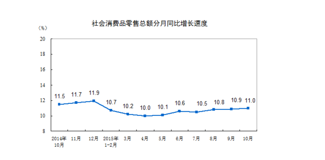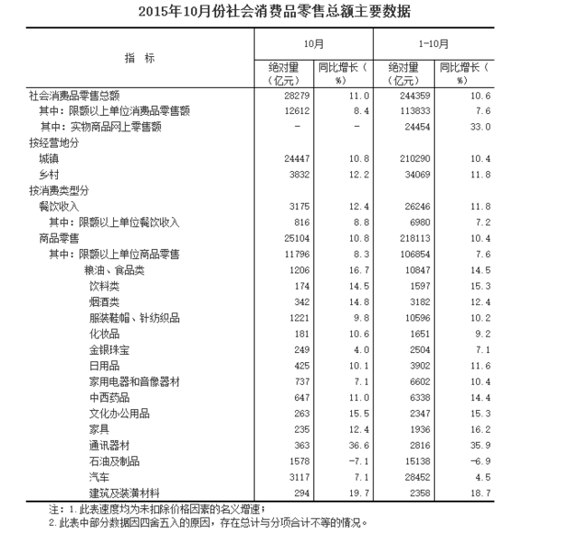 2015年10月份,社會(huì)消費(fèi)品零售總額28279億元,同比名義增長11.0%(扣除價(jià)格因素實(shí)際增長11.0%,以下除特殊說明外均為名義增長)。其中,限額以上單位消費(fèi)品零售額12612億元,增長8.4%。 2015年1-10月份,社會(huì)消費(fèi)品零售總額244359億元,同比增長10.6%。其中,限額以上單位消費(fèi)品零售額113833億元,增長7.6%。