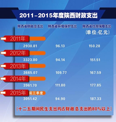 發展的目的在于改善民生。“十二五”期間,陜西經濟實力躍上新臺階,民生財政保障力度不減。5年間,我省不斷提高財政用于民生支出的比重,積極推進基本公共服務均等化,財政對民生的投入連年增長。據初步測算,我省財政支出2015年將突破4000億元,是2010年的1.8倍。在財政“蛋糕”不斷做大的同時,“蛋糕”分配結構也在明顯調整。“十二五”期間,我省民生支出占比一直高于80%,有力保障了就業、教育、社會保障、醫療衛生、文化項目、移民搬遷、 食品環保以及保障性住房建設、農林水等各項重點民生建設。