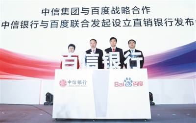 新京報訊(記者 劉夏 蘇曼麗)繼騰訊、阿里的“微眾銀行”、“網商銀行”后,百度與中信銀行昨日宣布,合資設立“百信銀行”。BAT三巨頭已宣告扎堆進入銀行業。