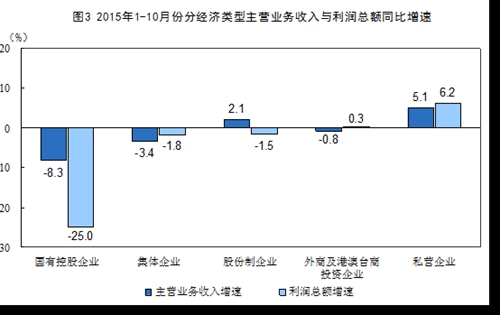 規模以上工業企業中,1-10月份國有控股企業實現利潤總額9080.6億元,同比下降25%;集體企業實現利潤總額395.3億元,下降1.8%;股份制企業實現利潤總額32698.7億元,下降1.5%;外商及港澳臺商投資企業實現利潤總額12082.9億元,增長0.3%;私營企業實現利潤總額17511億元,增長6.2%。