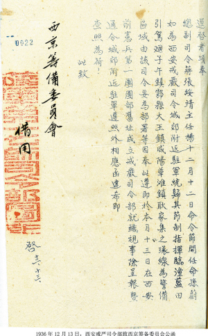此函開首一句最值得注意,其中“總、副司令蔣、張” ,即蔣介石和張學(xué)良將軍。1935年10月,中央紅軍到達(dá)陜北后,蔣介石即在西安設(shè)立“西北剿匪總司令部”,自兼總司令,張學(xué)良將軍副之,代行司令職權(quán)。其“綏靖主任楊”,則是指楊虎城將軍。“公函成文日期為1936年12月13日,此時,蔣介石已被張、楊所扣,拘禁在新城,而此函關(guān)于事變后西安的軍事部署,仍以蔣、張、楊等名義發(fā)出,其用意耐人尋味。”