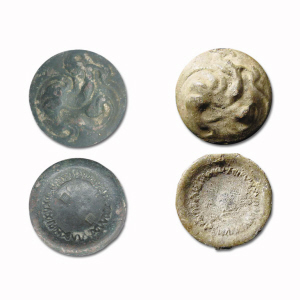 背面鑄有希臘銘文的鉛質白金三品圓形龍幣(右)與銅質圓形龍幣(受訪者供圖)